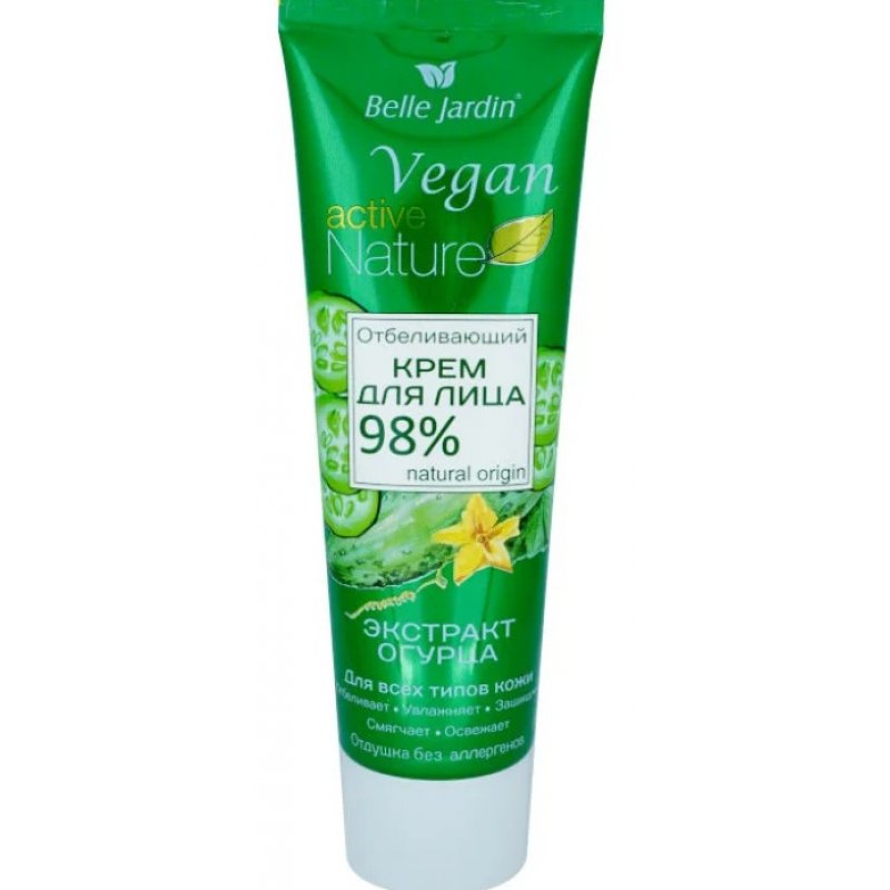 La crema viso schiarente Vegan Active Nature di Belle Jardin con estratto di cetriolo è un trattamento efficace per schiarire le macchie dell'età e uniformare il tono della pelle. Arricchita con ingredienti naturali, la crema idrata, ammorbidisce e rinfresca la pelle, donandole una luminosità naturale. Adatta a tutti i tipi di pelle, può essere utilizzata quotidianamente.