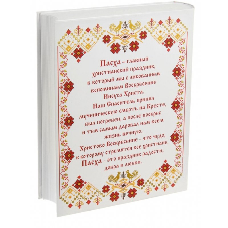 Книга-шкатулка "Пасха народная " - изготовлена из качественного пластика обклеенного плотной бумагой с полноцветным изображением и с золотистым тиснением орнамента. Эту книгу стоит поддержать в руках, чтобы всецело оценить ее качество и великолепный вид.Она будет достойным подарком к празднику Пасхи и порадует Ваших близких.