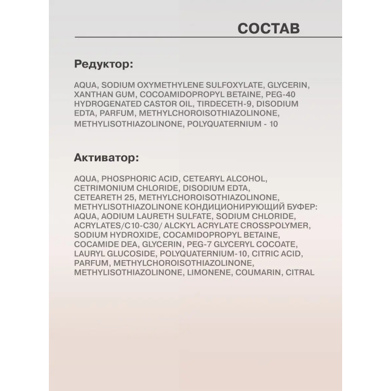 La confezione contiene 1 flacone di decolorante (110ml), 1 confezione di attivatore (110ml), 1 bustina di balsamo, istruzioni d'uso, guanti protettivi. Attenzione! Non utilizzare su irritazioni o ferite. Effettuare il test della sensibilità su una piccola zona prima dell'utilizzo. Evitare il contatto con gli occhi; in caso di contatto con gli occhi sciacquare immediatamente. Utilizzare i guanti protettivi e seguire attentamente le istruzioni d'uso. Possibile reazione allergica in caso di intolleranza individuale del prodotto. Tenere fuori dalla portata dei bambini. Chiudere il prodotto dopo l'utilizzo, senza scambiare i tappi. Contiene methylizothiazolinone.