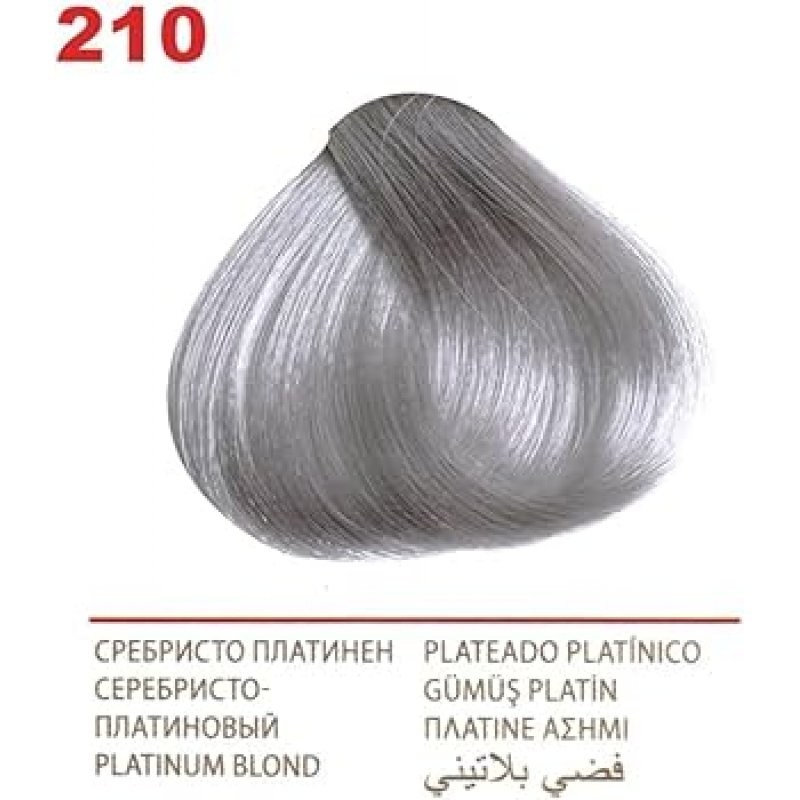 Crema Colorante per capelli, 210 Argento platino, con uno speciale complesso di proteine di grano, vitamina C e F. Contenuto della confezione: 1 tubetto di crema da 50 ml; 1 flacone ossidante da 50 ml; 1 sacchetto di balsamo per capelli tinti da 15 ml; 1 guanto da 1; Crema - Ossidante 1:1