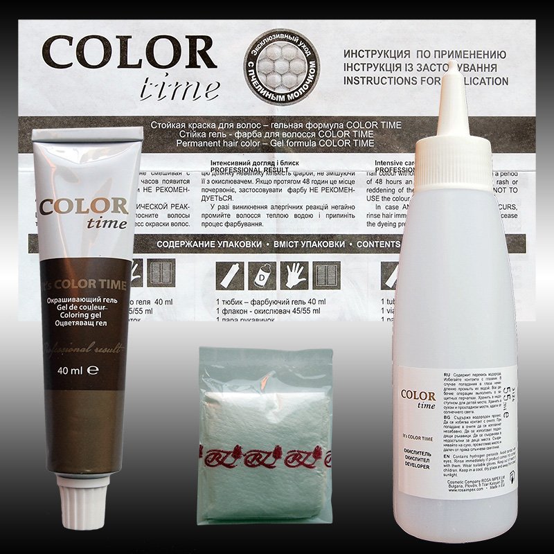 Ottieni un colore radioso e naturale con Color Time Royal Jelly Vitamin C Permanent Gel Hair Color. Colore permanente per capelli di qualità premium che offre un colore intenso e un'ampia copertura del grigio. Disponibile in una vasta gamma di colori. La tinta permanente in gel con pappa reale e 18 aminoacidi, peptidi, proteine e steroli nutrono e ristrutturano i capelli. La formula in gel consente una miscelazione e un'applicazione sui capelli facili e senza gocce e contribuisce alla penetrazione delle molecole di colore. Finitura professionale e di qualità dalla sua applicazione. Goditi un colore più intenso e brillante, oltre a una lunga durata che ti permetterà di sfoggiarlo più a lungo. Le sostanze nutritive della pappa reale risultano essere "il materiale fondamentale" per le cellule ciliate, contribuendo al recupero e fortificazione della sua struttura ea migliorarne l'aspetto. Prima dell'uso, leggere attentamente le istruzioni passo passo incluse nella confezione. Il risultato del colore dipende dal colore dei tuoi capelli. Se i tuoi capelli sono due toni più scuri del colore scelto, ti consigliamo di utilizzare prima lo sbiancamento intensivo n. 111 per attenuare la tonalità, in modo da ottenere l'effetto desiderato. Ingredienti:Gel Colorante: Aqua, Ammonia, Acrylates/C10-30 Alkyl Acrylate Crosspolymer, Cocamidopropyl Betaine, Propylene Glycol, Pentasodium Pentetate, Erythorbic Acid, Silicone Quaternium-20, Thiolactic Acid, Disodium Cocamphodiacetate, Glycerin, Royal Jelly, P-Phenylendiamine, P-Aminophenol, Resorcinol, M-Aminophenol, 1-Naphtol. Los componentes pueden variar de un color a otro. Crema Oxigenada: Aqua, Hydrogen Peroxide, Ceteareth-7, Pentasodium Pentetate, Disodium Pyrophosphate, Sodium Stannate, Phosphoric Acid.