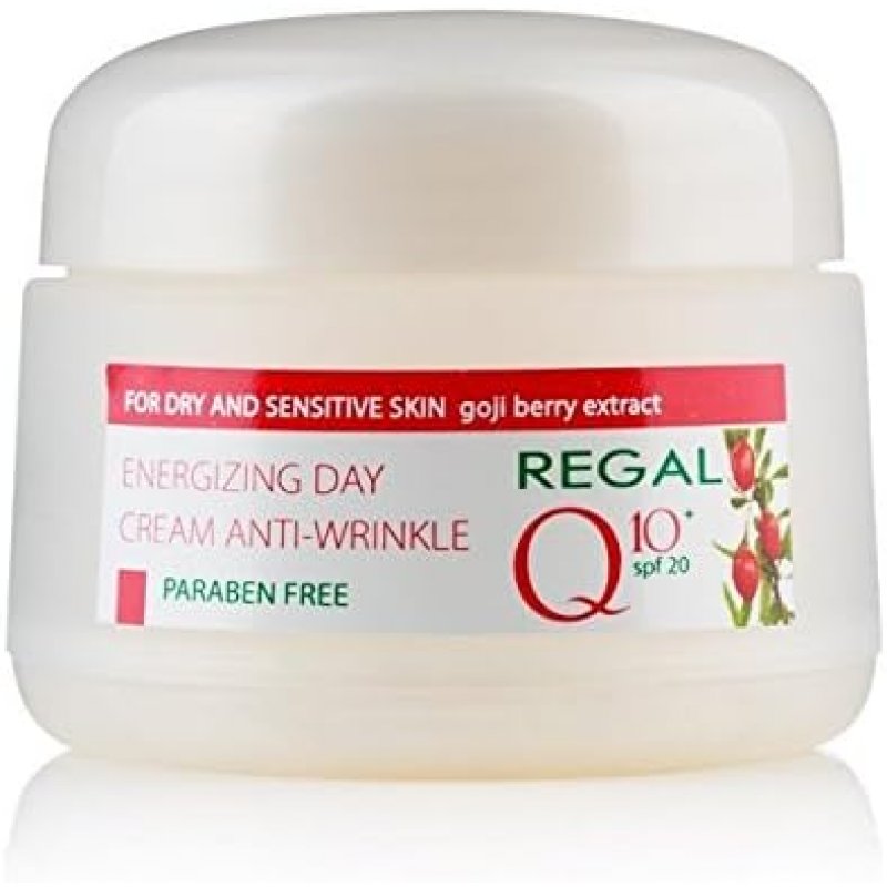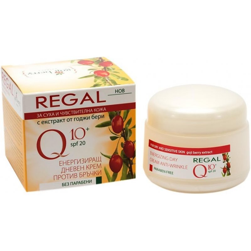 Regal Q10+ Crema Giorno Energizzante antirughe + con estratto Goji Baya SPF 20 per una pelle fresca, radiosa e più giovane. L'estratto di bacche di Goji è ricco di aminoacidi, polisaccaridi, antiossidanti e micronutrienti. La crema aiuta a eliminare le rughe esistenti e previene la comparsa di nuove rughe. Protegge contro l'invecchiamento precoce, la comparsa di pigmentazione causata dai raggi ultravioletti A e UVB con SPF 20, donando giovinezza, energia e bellezza alla tua pelle.